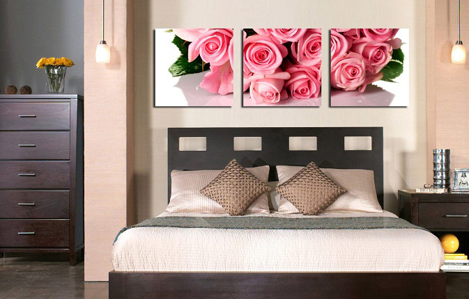 Изображение очаровательного розового букета наполнит комнату свежестью и дивным ощущением праздника. Такой триптих удачно подчеркнет романтическую обстановку спальни или гостиной.