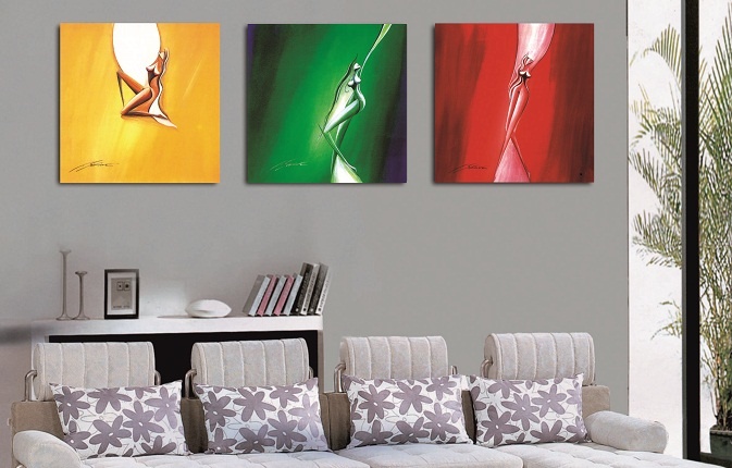 Необычные репродукции с изображением женских фигур в ярком обрамлении глубокого фона удачно и красочно дополнят интерьер.