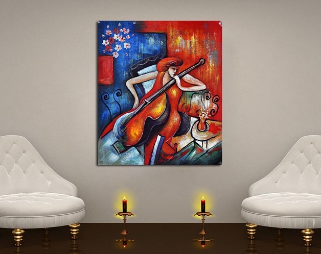 Изысканная картина «Виолончелистка» идеально впишется в любой классический интерьер в спокойных тонах. Полотно, на котором изображена женская фигура, грациозно сжимающая в «объятия» свою виолончель, понравится всем ценителям тонкой красоты с легкими нотками аристократичности.