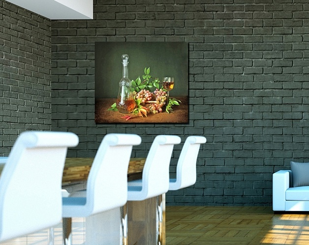 Изысканная интерьерная картина «Дары винограда» превосходно будут смотреться в столовой или кухни, придав особого шика помещению.