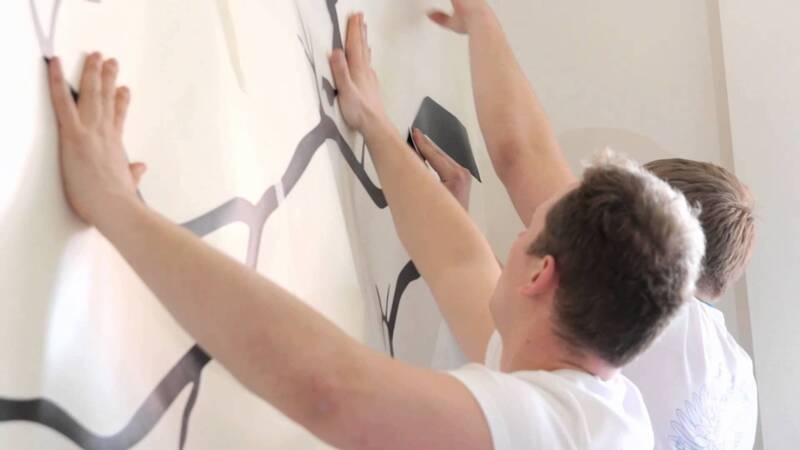 Для фиксации полотна защитный слой снизу нужно снять и плотно прижать к стене: на полотна уже нанесен клей, поэтому обои остается только разгладить руками.