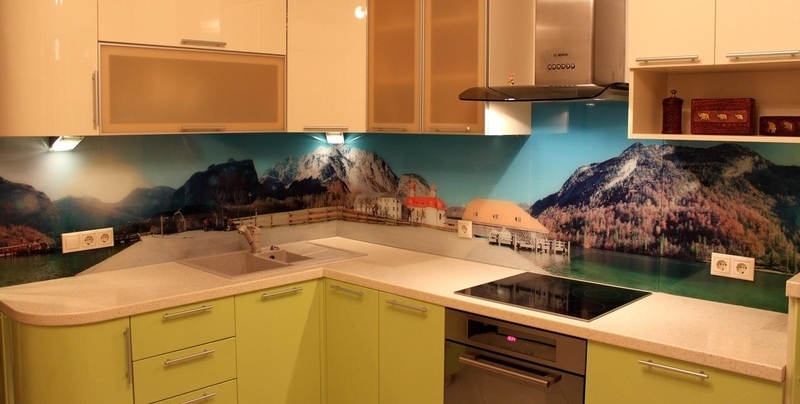 Самый дорогой, но в то же время самый надежный вариант: цена оправдывает качество. Основа представляет собой три склеенных стеклянных полотна, между которыми прокладывается пленка (одна из них – с рисунком). Такое производство гарантирует надежность всего фартука, а также яркость рисунка даже спустя годы эксплуатации кухни.